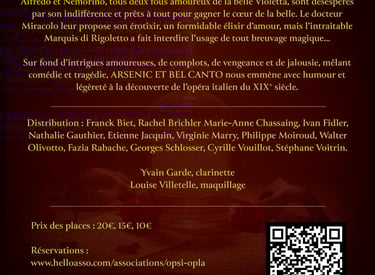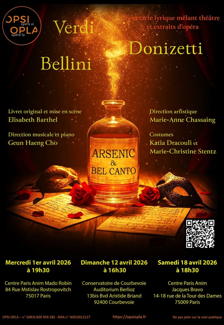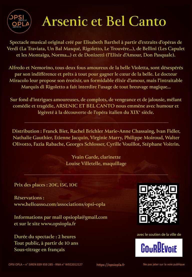 En 2026, l’opéra italien est à l’honneur avec un spectacle musical original ARSENIC ET BEL CANTO, créé par Elisabeth Barthel à partir d’extraits d’opéras de Verdi (La Traviata, le Bal Masqué, Rigoletto, Le Trouvère), de Bellini (les Capulet et les Montaigu et Norma) et de Donizetti (l’Elixir d’Amour, Don Pasquale)